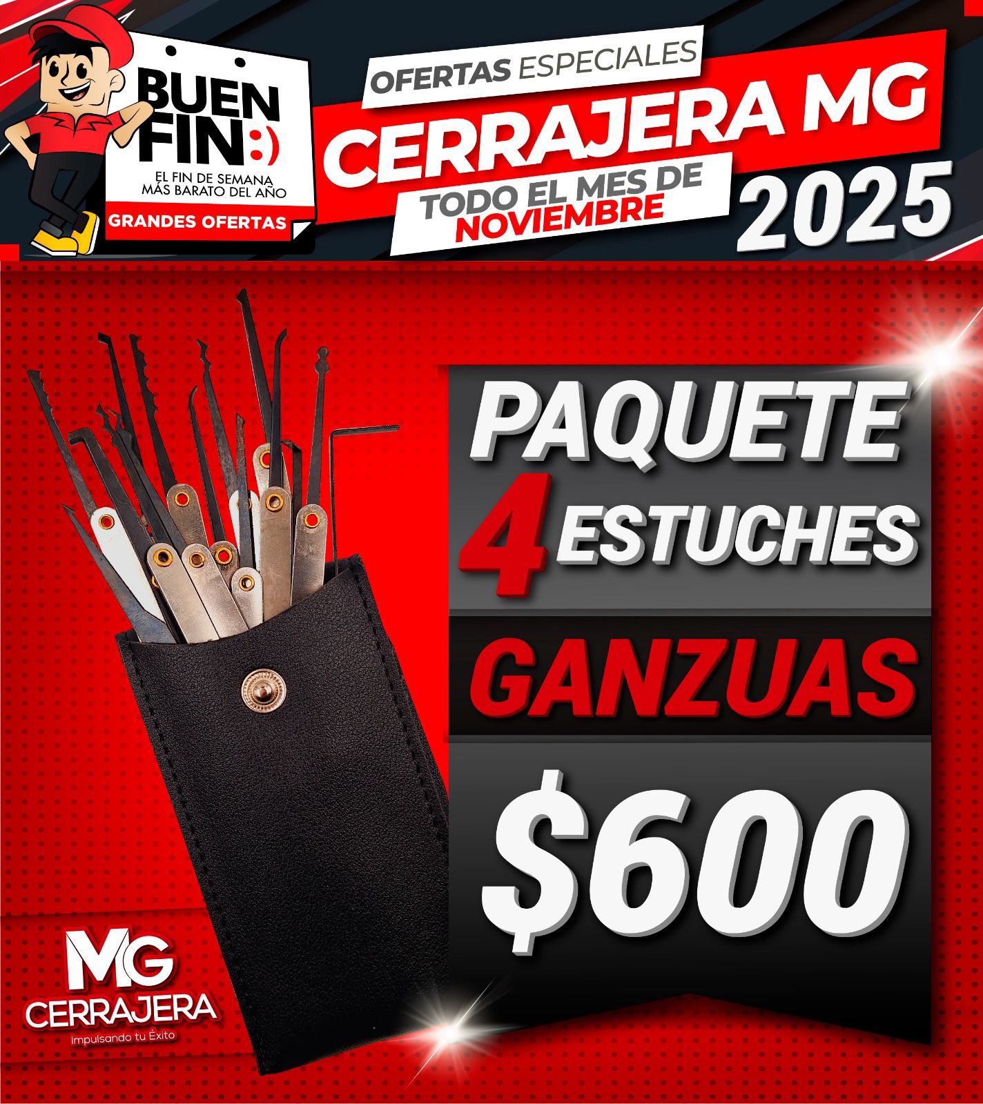 Cada estuche incluye una selección de ganzúas de distintas formas y medidas, permitiendo trabajar con cerraduras de cilindro, automotrices y de seguridad. Su diseño ergonómico y materiales de alta calidad garantizan un manejo cómodo y duradero.